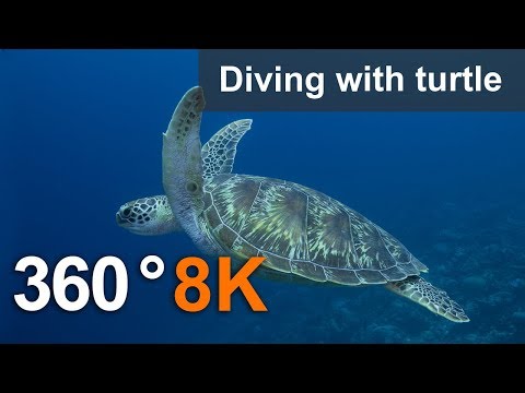 360°, Diving with turtle. 8K Underwater video