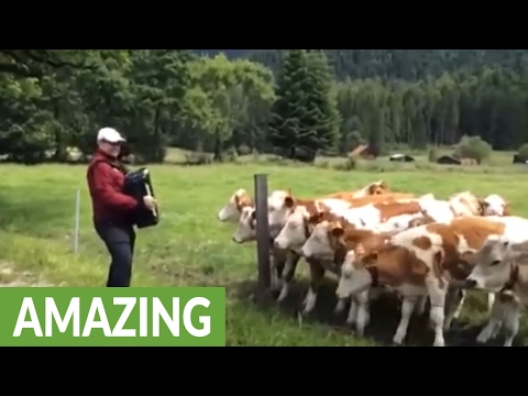 Grazing cows rush to listen to accordion music
