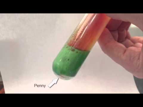 The demonstration is done in a fume hood to remove any of the NO2 gas generated by the reaction of the nitric acid with the copper in the penny (note this is a pre-1982 penny and made entirely of copper).